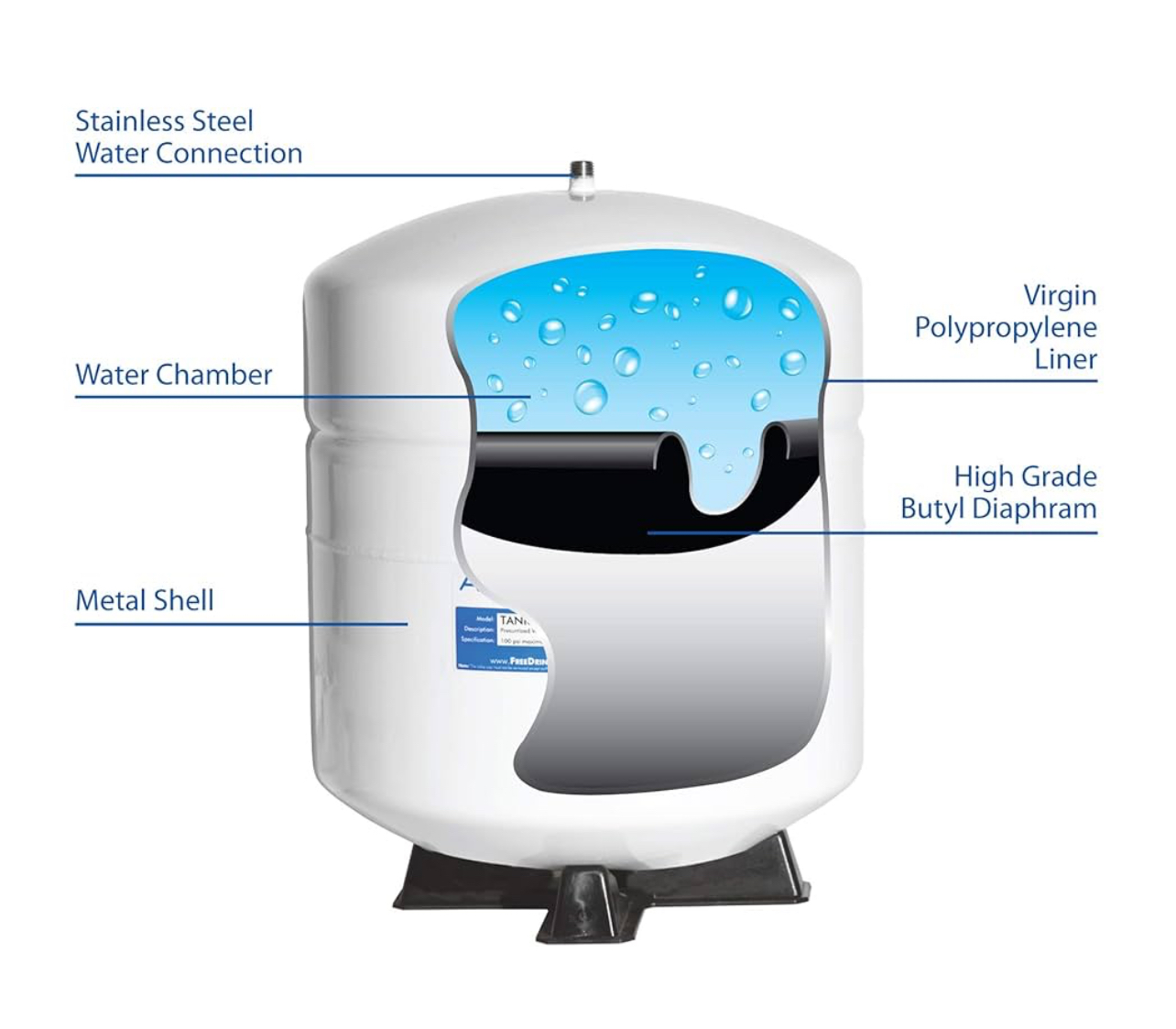 The PAE RO-152 is a reverse osmosis water storage tank designed for durability and safety. It features FDA-approved materials, including a virgin polypropylene liner and a high-grade chlorobutyl diaphragm, ensuring that stored water remains tasteless, odorless, and contaminant-free. The sealed brass air valve and o-ring sealed cap help maintain a leak-free air chamber.