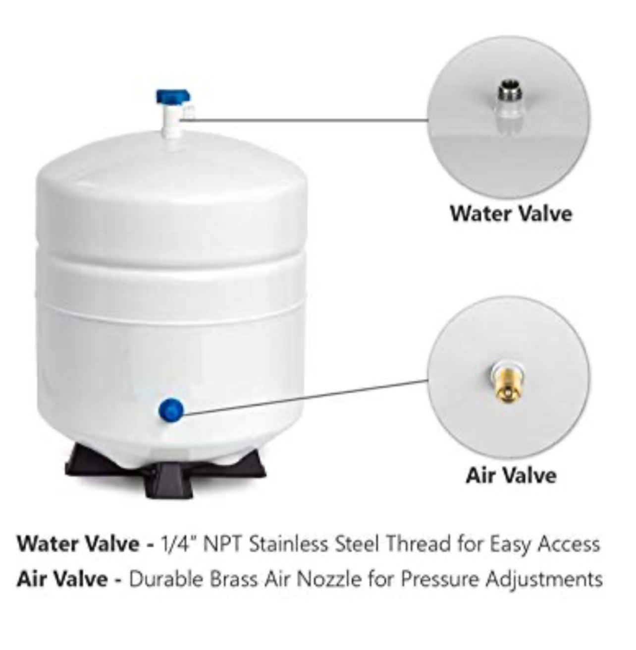 This tank is commonly used in reverse osmosis filtration systems to store purified water before dispensing. It has a stainless steel 1/4″ MPT water connection for secure installation.